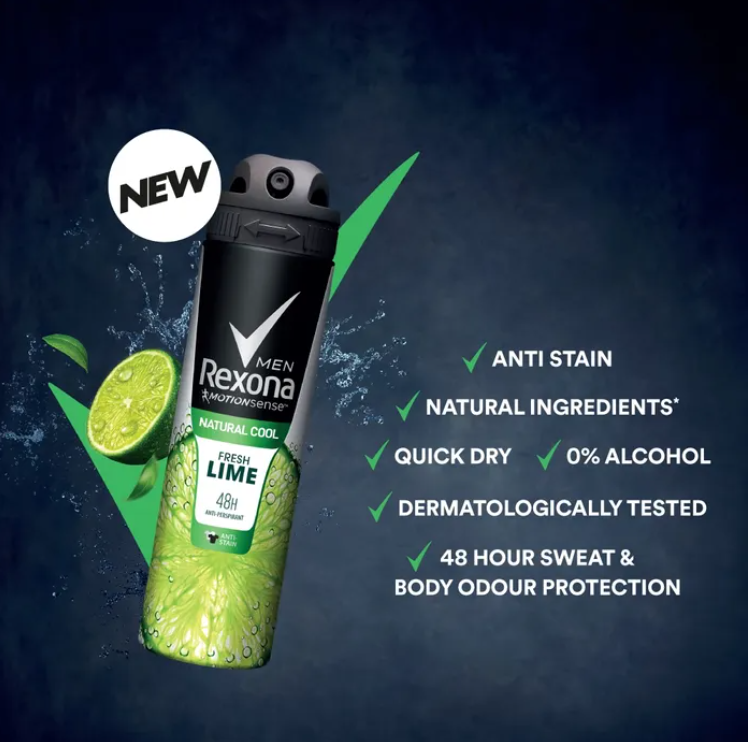 NEW Rexona Men Natural Cool Fresh Lime powered by nature that gives you 5X freshness without leaving any stain on your clothes!